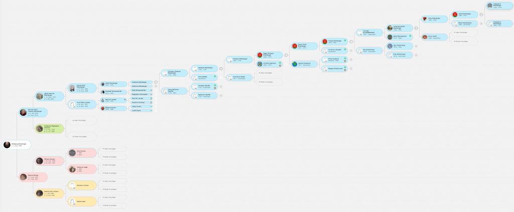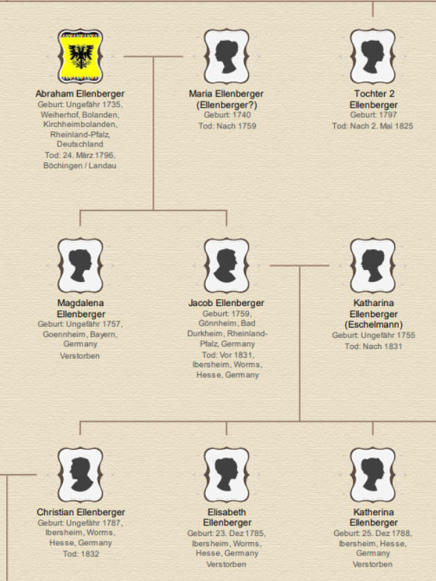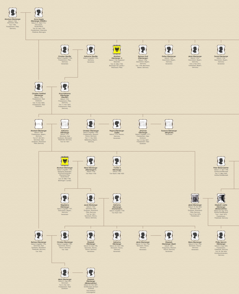 Das ist meine Ahnenlinie bis in die Schweiz. Nicolaus Ellenberger (1667-1724) kam aus der Schweiz in die Pfalz nach Friedelsheim, wo mein Ururgroßvater Jakob (1800-1879) lebte, sein Sohn Daniel Adolf ging nach Monsheim, wo mein Großvater geboren wurde. Mein Vater wurde dann in Neustadt an der Haardt (heute Neustadt an der Weinstraße) geboren, von wo er als Kind nach Rosenheim zog, er zog dann mit mir als Kind von München nach Hamburg.