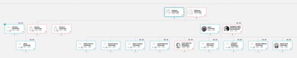 In obiger Verflechtungsgraphik enthalten sind der Bruder von Jakobs (1800-1879) Großvater, der ebenfalls Abraham hieß und eine Maria (geborene Ellenberger!) heiratete, und beide hatten einen Sohn Jakob (1759-vor 1831), dessen Sohn Christian Ellenberger (1787-1832) die Schwester von Jakob Ellenberger (1800-1879) heiratete – wie oben beschrieben….